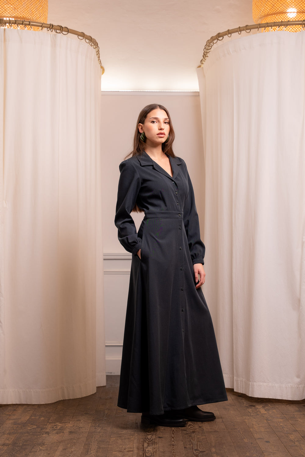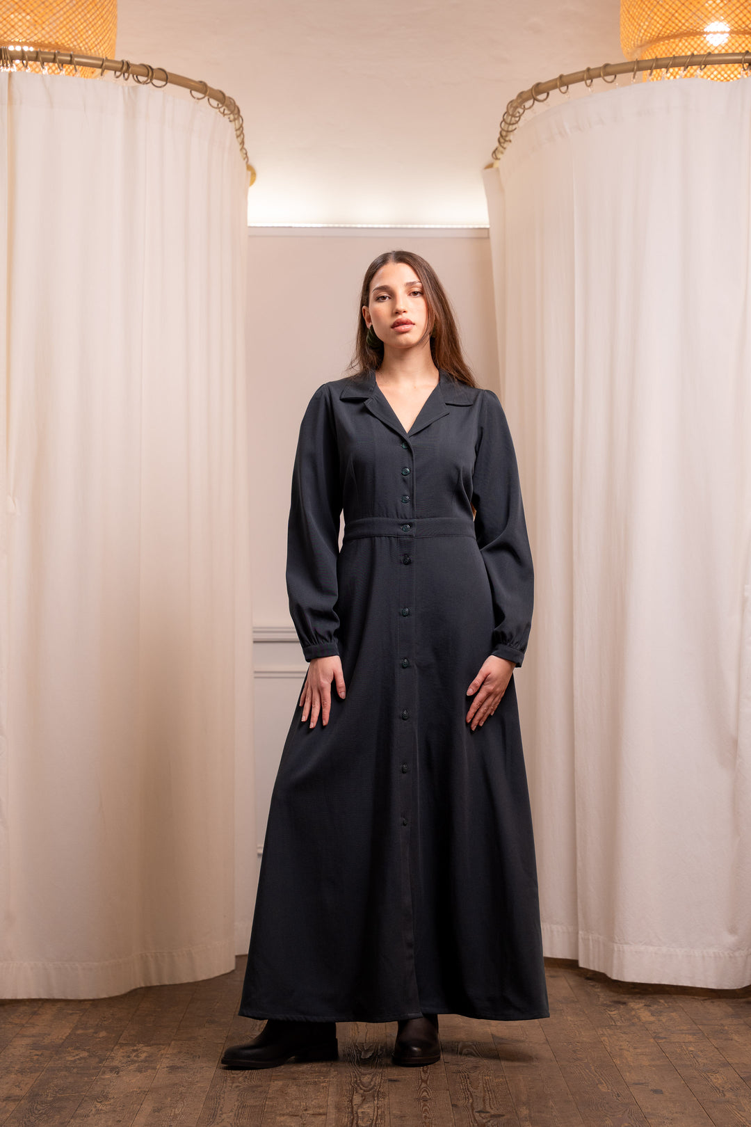 Dark Green Wool Shirt Dress - Tailored Shirt Dress Made in Italy