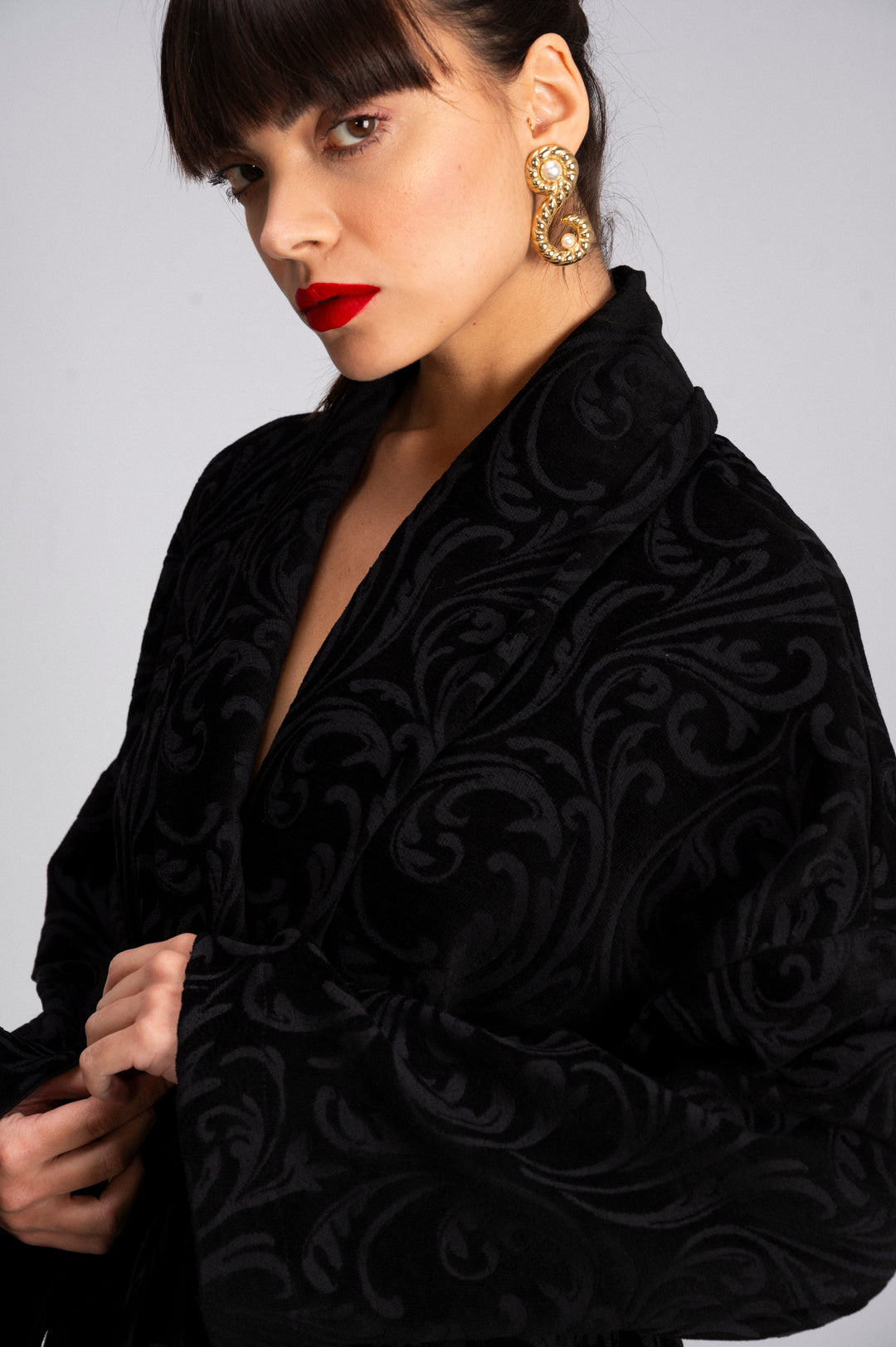 Damask Print Velvet Kimono - Wide Sleeves and Belt Made in Italy