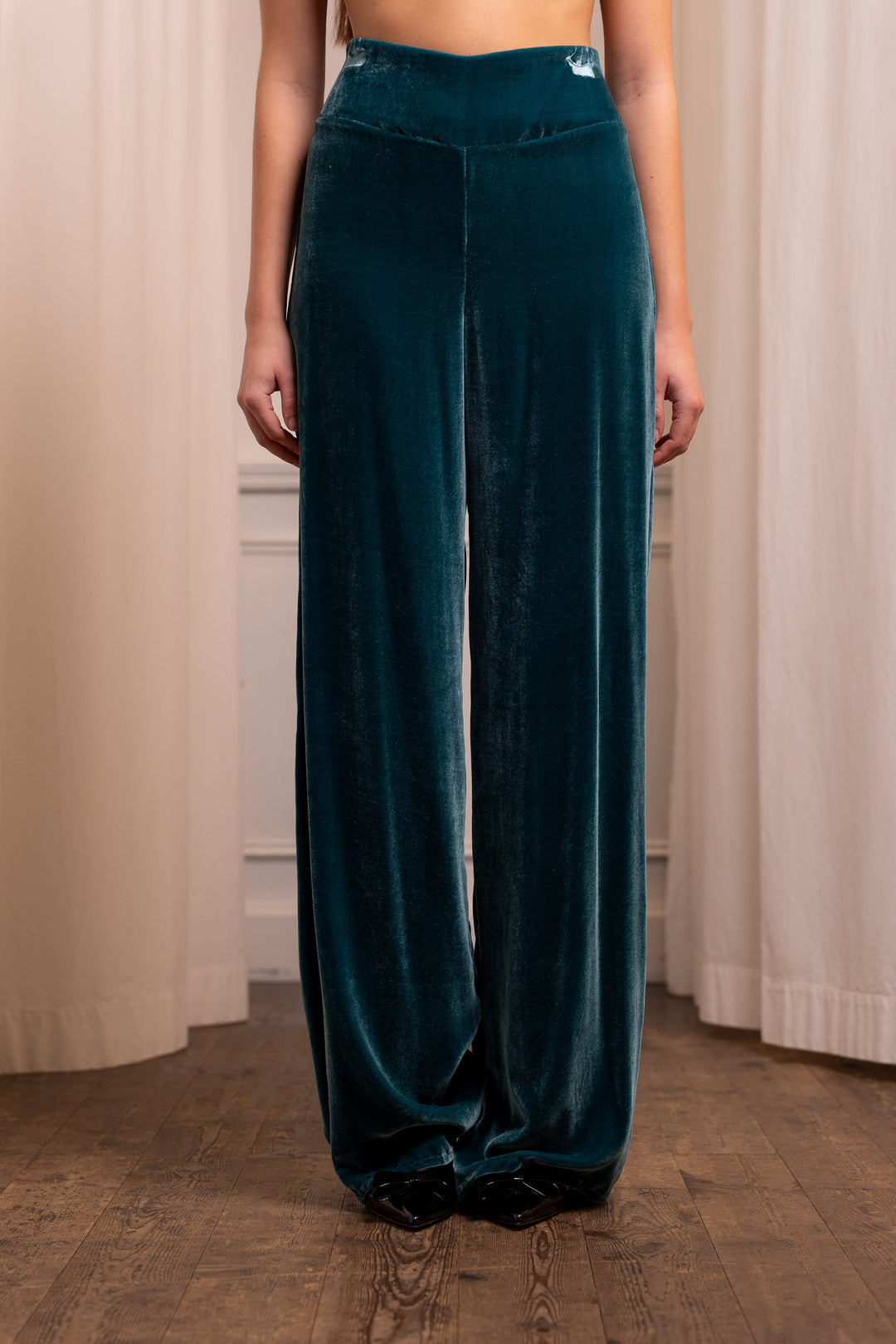 100% Silk Velvet Palazzo Pants in Teal - Made in Italy